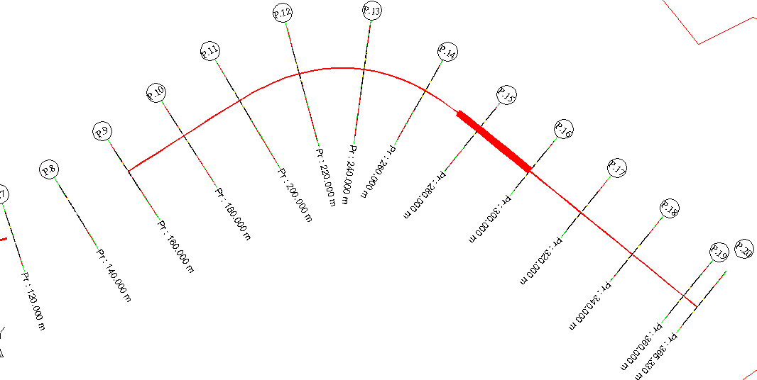 - De l’abscisse 180 à 280, une polyligne d’épaisseur 0.2m est dessinée identique à celle du profil P9.