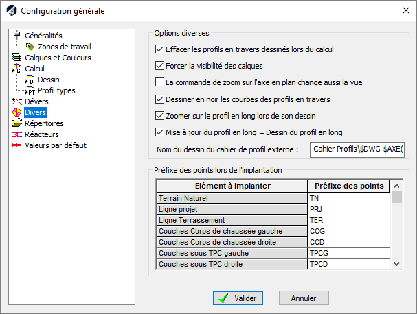 Ainsi, l’utilisateur peut paramétrer les noms des points d’implantation des lignes terrain naturel, projet, corps de chaussée, fond de forme, sous BAU, sous TPC, terrassement, et sous talus.